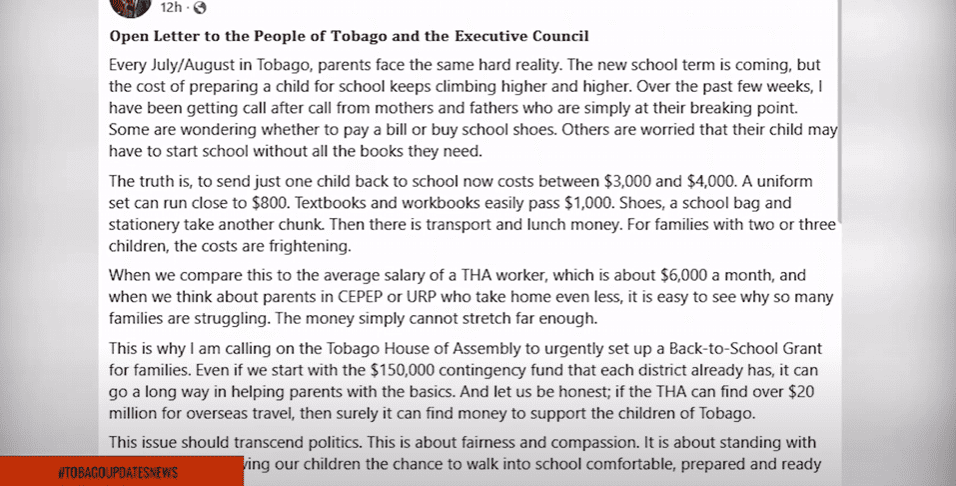 August 20, 2025 – Minority Leader Kelvon Morris is appealing to the Tobago House of Assembly (THA) Executive Council to urgently introduce a Back-to-School Grant to...